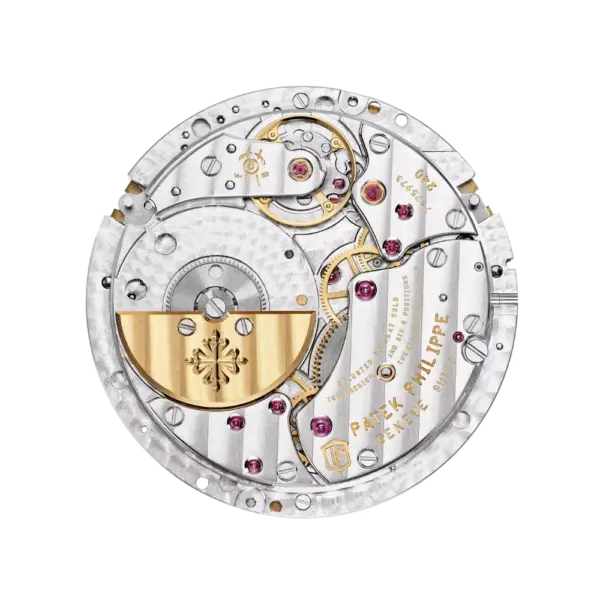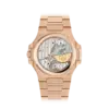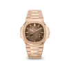 The Nautilus 5712/1R-001 embodies a refined blend of sportiness and mechanical sophistication. Crafted entirely in 18K rose gold, it features a beautifully asymmetrical gradient brown-to-black dial with signature horizontal embossing. This model integrates three elegant complications: date by hand, moon phase, and power reserve indicator — a true showcase of Patek Philippe’s mastery in fine watchmaking.