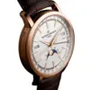 The Vacheron Complete Calendar 4010T/000R-B344 embodies timeless sophistication with its stepped 41mm case in 18K pink gold, fluted caseback, and railway minute-track. Its elegant silver-toned opaline dial integrates day and month apertures with a central date pointer, while a meticulously detailed moon phase display at 6 o’clock adds a poetic touch. This timepiece perfectly balances traditional aesthetics and fine Swiss craftsmanship.